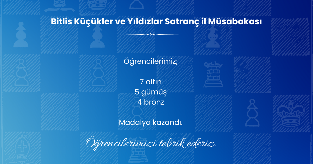 On Sunday, 21.02.2025, at the Türkiye Chess Federation Bitlis Minors and Juniors Chess Provincial Tournament hosted by our school, our students achieved outstanding success. Burak A., Mustafa Eren D., Şevin Rojbin Y., Muhammed Miraç A., Zeynep Jinda A., Yusuf Ş., and Rahime K. won gold medals; Muhammed Eren G., Eflin I., Hasan A., Şadya O., and Yusuf B. won silver medals; and Harun Roni I., Züleyha G., Miran A., and Elif Ece A. won bronze medals. We congratulate our students, who earned a total of 7 gold, 5 silver, and 4 bronze medals, on their excellent performance.